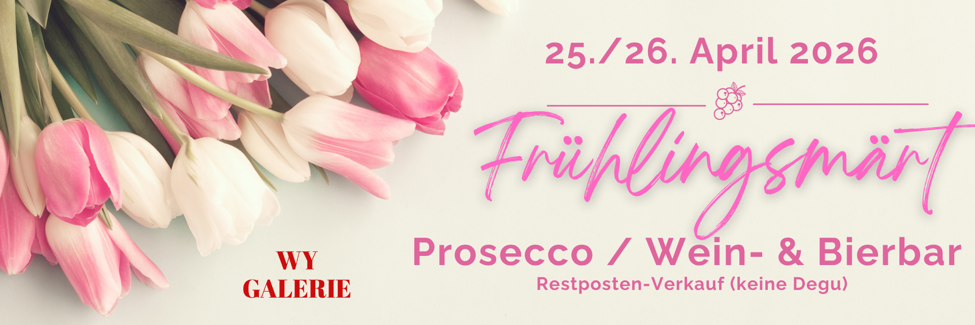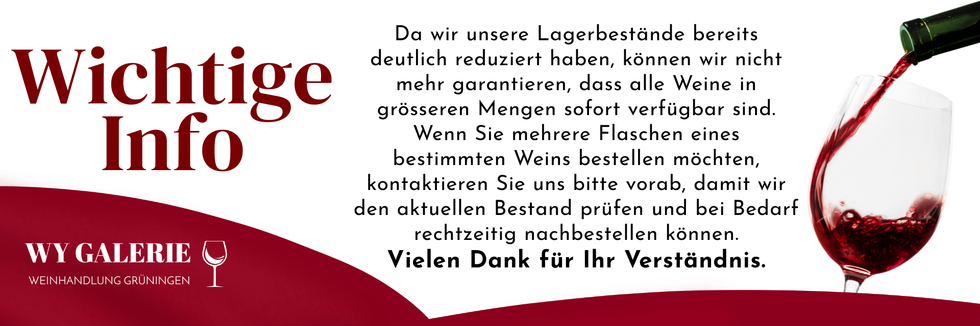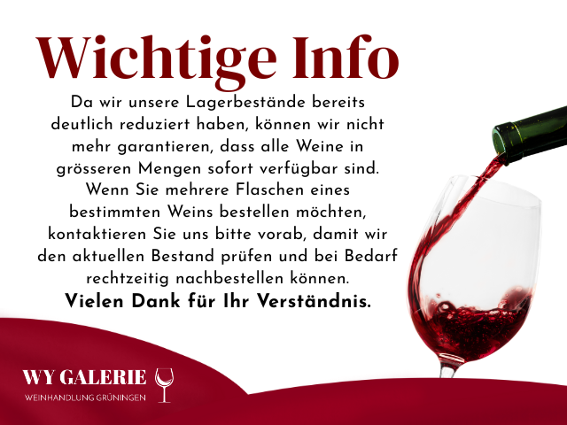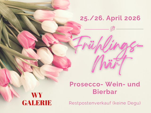 Ganz weg sind wir aber nicht: Die Wy-Galerie bleibt bestehen – nur eben ein bisschen anders. Künftig findet ihr uns an den drei grossen Grüninger Märkten als Wein- und Bier-Bar. Wir freuen uns riesig, euch dort weiterhin zu treffen, gemeinsam anzustossen und die guten Gespräche fortzuführen.