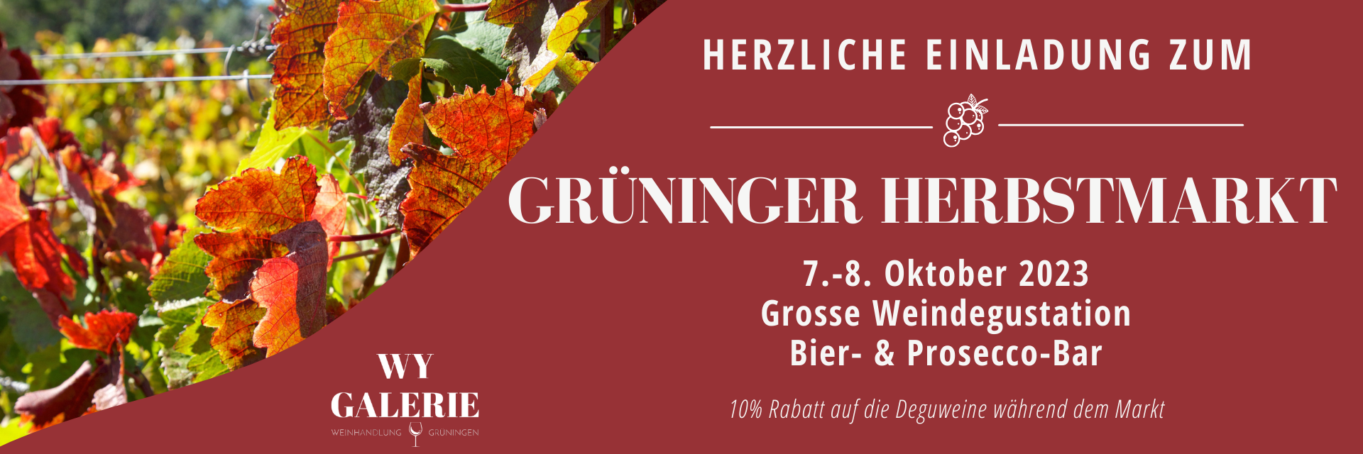 Ganz weg sind wir aber nicht: Die Wy-Galerie bleibt bestehen – nur eben ein bisschen anders. Künftig findet ihr uns an den drei grossen Grüninger Märkten als Wein- und Bier-Bar. Wir freuen uns riesig, euch dort weiterhin zu treffen, gemeinsam anzustossen und die guten Gespräche fortzuführen.